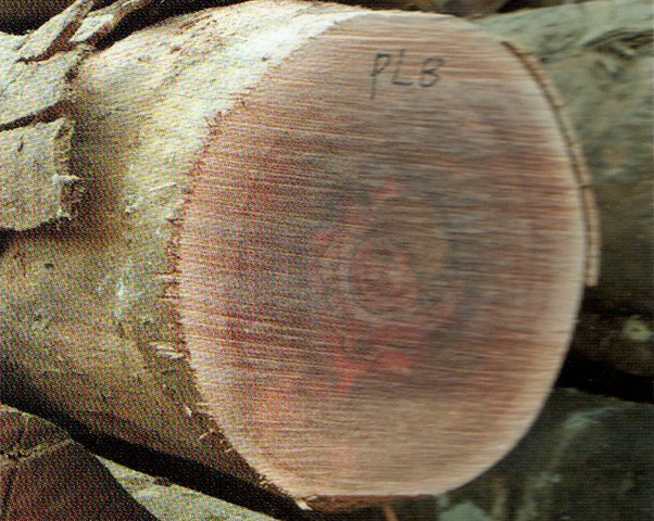 心邊材略明顯。心材暗紅褐色帶紫色調(diào),心部具不規(guī)則花紋。邊材色稍淺,寬3~4cm。生長(zhǎng)輪略明顯,輪間界以深色組織帶。
